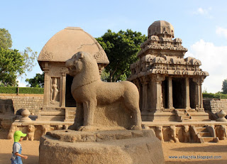 Começo por mostrar o Complexo Principal de Mahabalipuram constituído por 5 rathas e várias esculturas. Deverá notar-se que antes de serem esculpidos aqui só existiam rochas, como algumas que se vêem em primeiro plano...