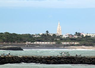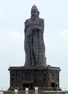À direita, uma das maiores atracções de Kanyakumari: a estátua de pedra que evoca Thiruvalluvar, o grande poeta, filósofo e santo, autor do poema épico Thirukural, um dos maiores clássicos da literatura tamil, que terá vivido, não se sabe ao certo, entre o séc. II AC e o séc. V DC. Aquela obra tem 133 capítulos e daí a estátua ter uma altura de 133 pés (cerca de 40 metros). Foi construída no ano 2000 e nela trabalharam mais de 5000 escultores...