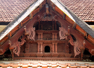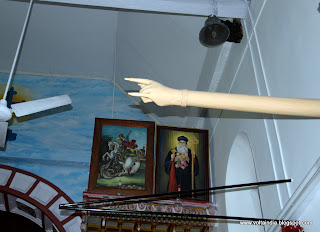 ...a frente, com o alpendre, fica do outro lado.A primeira que visitei foi a igreja de Santa Maria de Cheriyapaly que é um raro exemplo da arquitectura indo portuguesa em Kerala. Foi inaugurada em 1579 e nela se destacam os alpendres com tectos em madeira (obra da mais fina marcenaria!) e as pinturas interiores - como nas igrejas cristãs de São Tomé, por tradição, não existem imagens (estátuas), as pinturas, atribuídas a um pintor português, destacam-se por conterem elementos decorativos europeus.