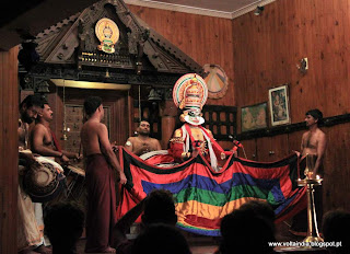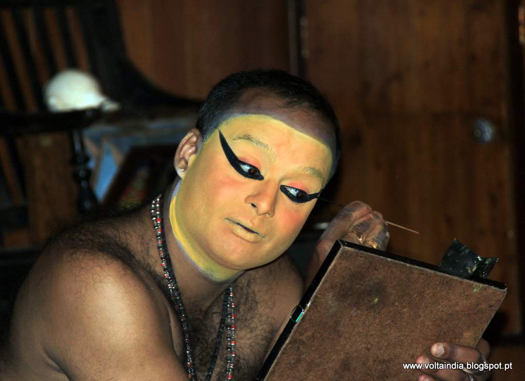 O teatro de Kathakali é o teatro/dança indiano. Aqui se combinam, de forma harmoniosa, cinco formas de arte: literatura, música, pintura, dança e arte dramática. Como já descrevi o Kathakali quando em 2009 aqui estive, neste post mostrarei, fundamentalmente, a sessão de pintura antes do espectáculo.